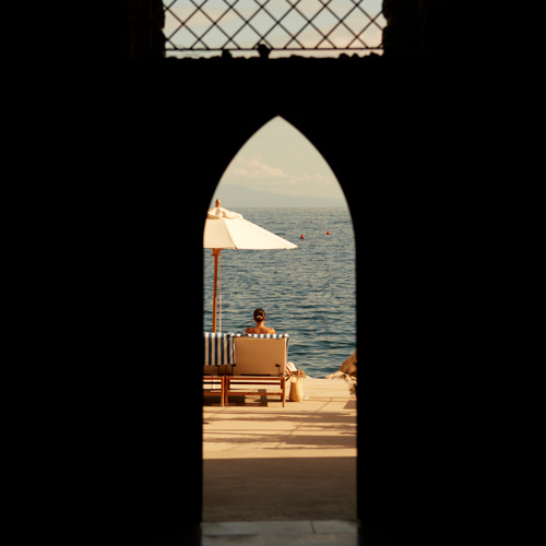 A wonderful private beach of white pebbles washed by a crystal clear sea, with restaurant and bar service directly under your parasol.