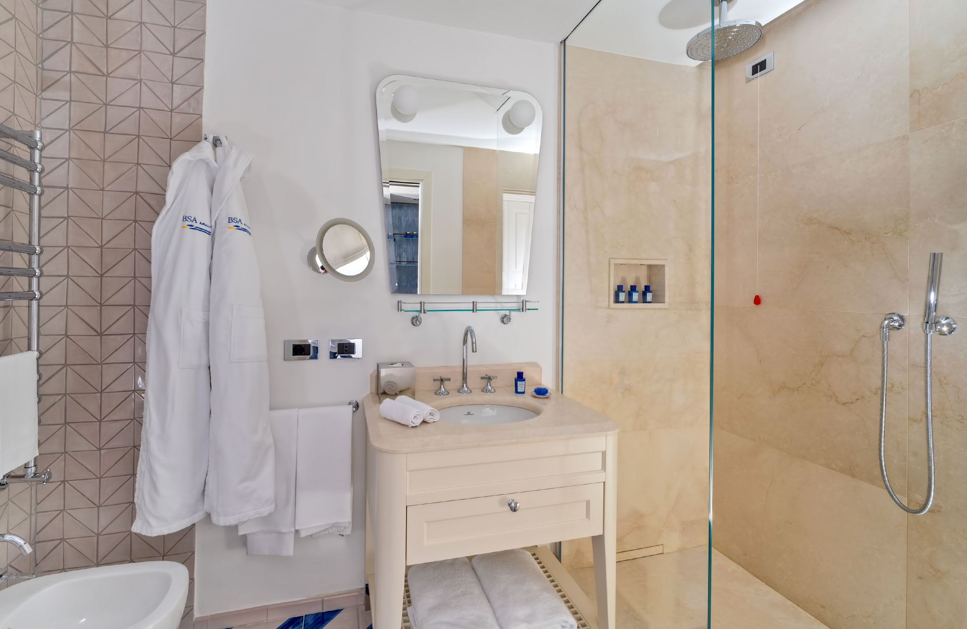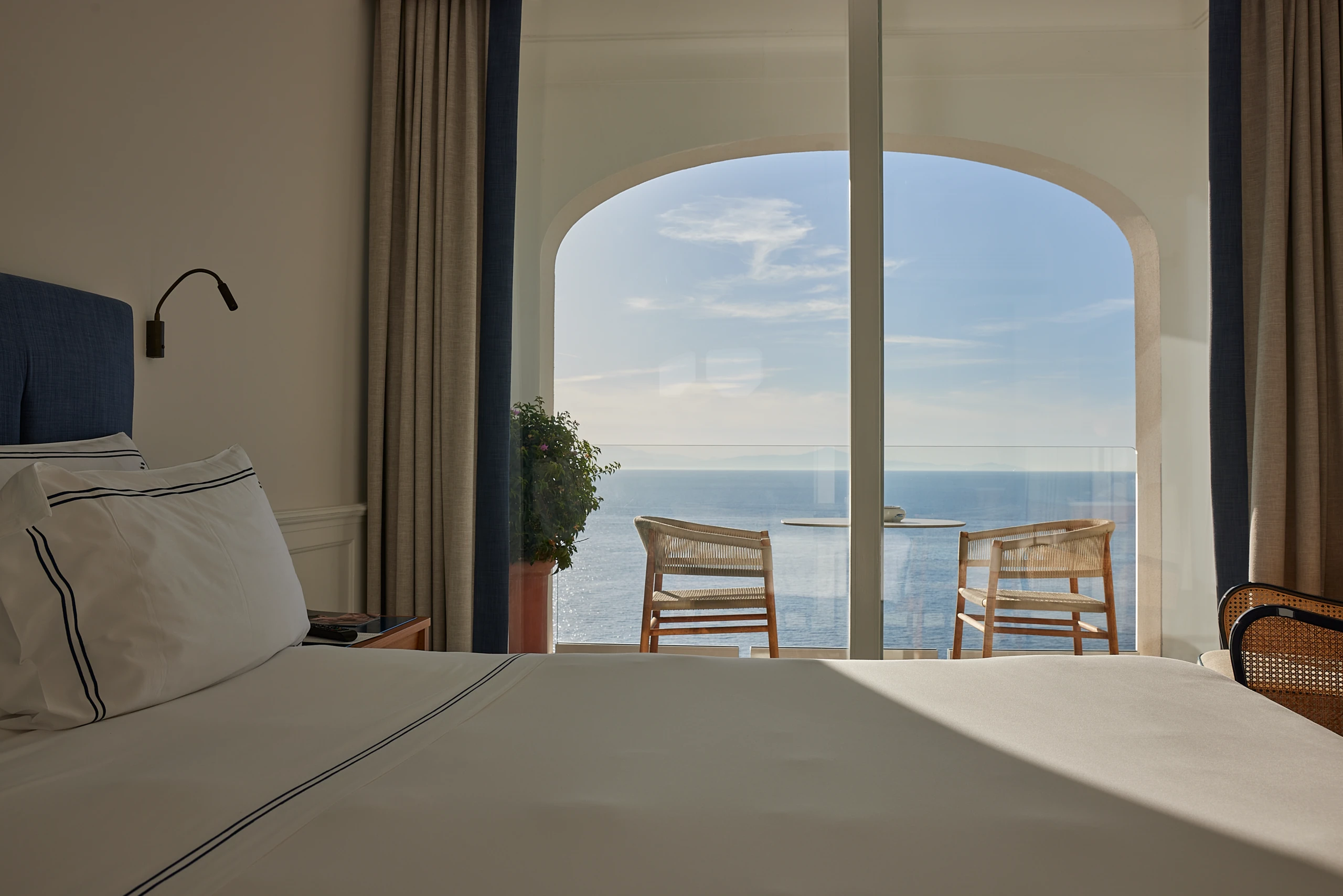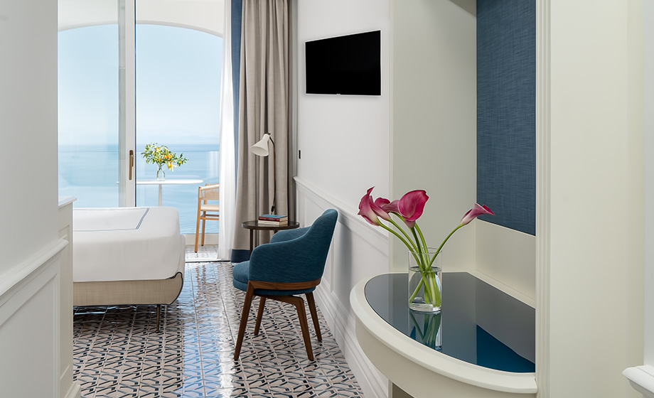 Decisively luxurious, the room features handmade ceramic tiles, a full-size marble bathroom and a stunning sea view also with private balcony or french balcony.