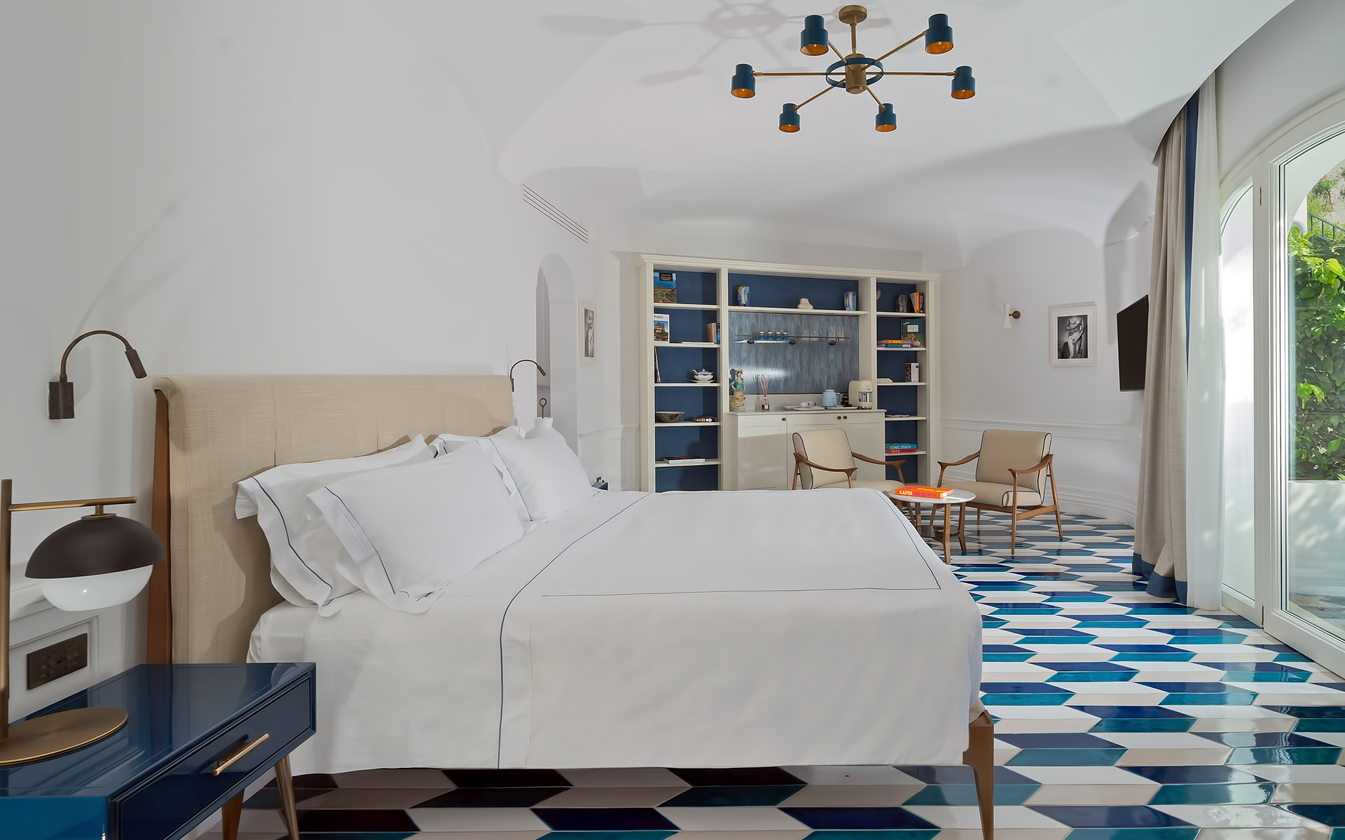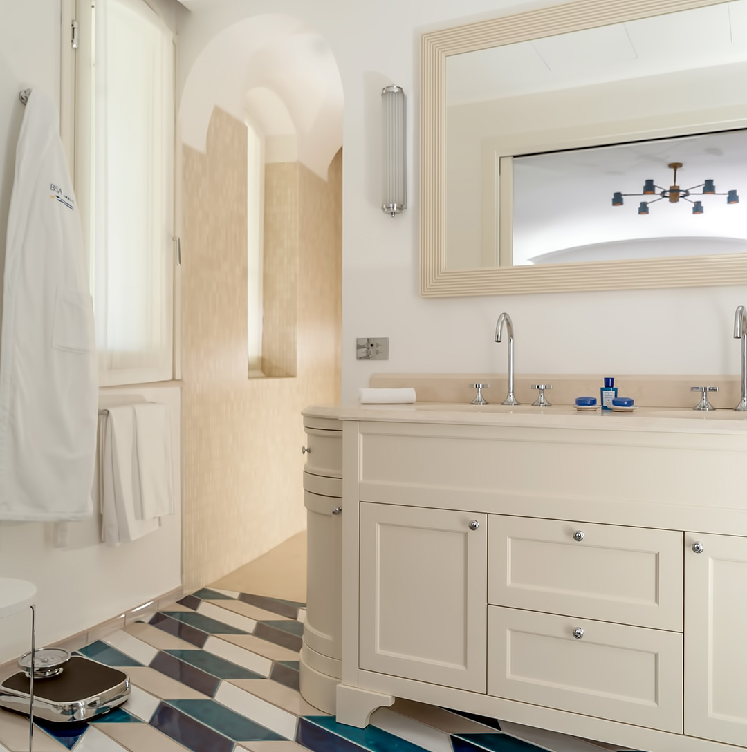 La suite è arredata con pezzi di arredo dei migliori marchi italiani e con mobili su misura progettati dai nostri designer guidati dall'architetto Rino Gambardella e realizzati da maestri artigiani locali.