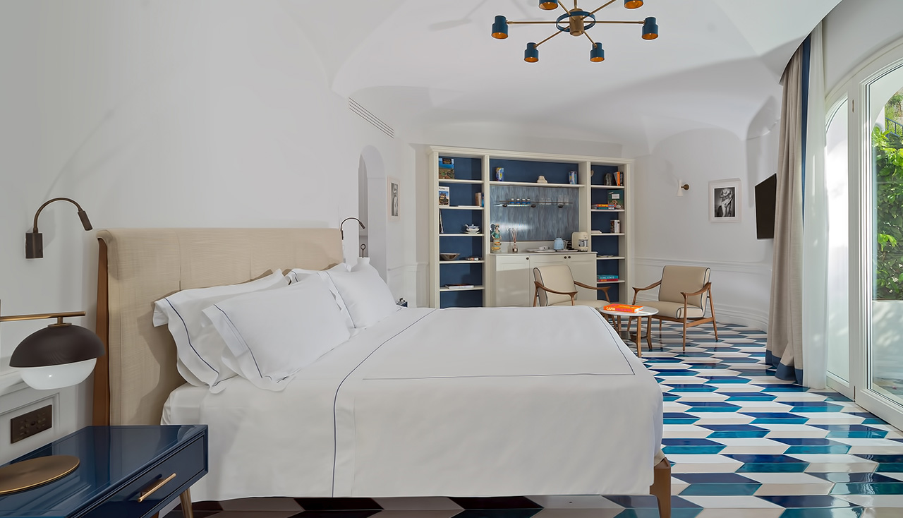 La Junior Suite vista mare e piscina è la quintessenza del glamour italiano, un perfetto rifugio con vista sul blu infinito.