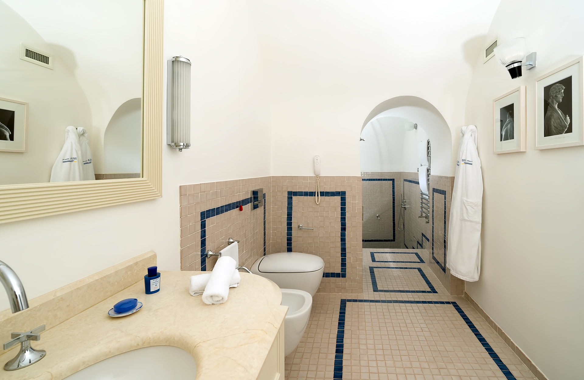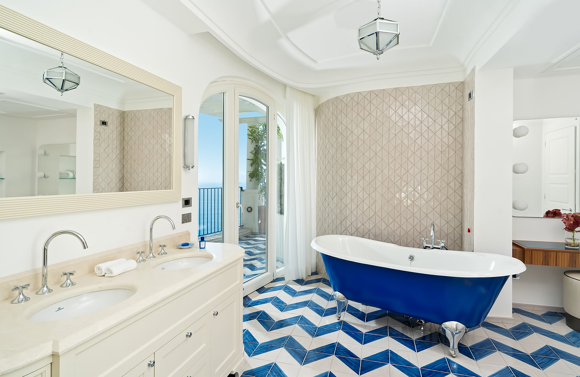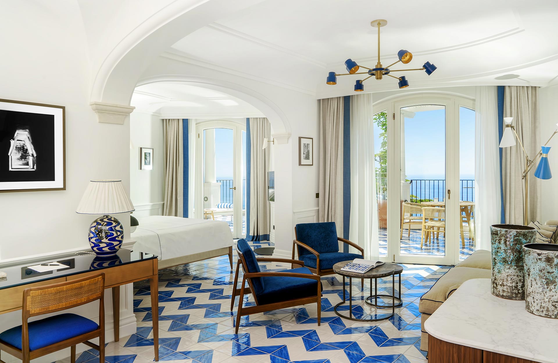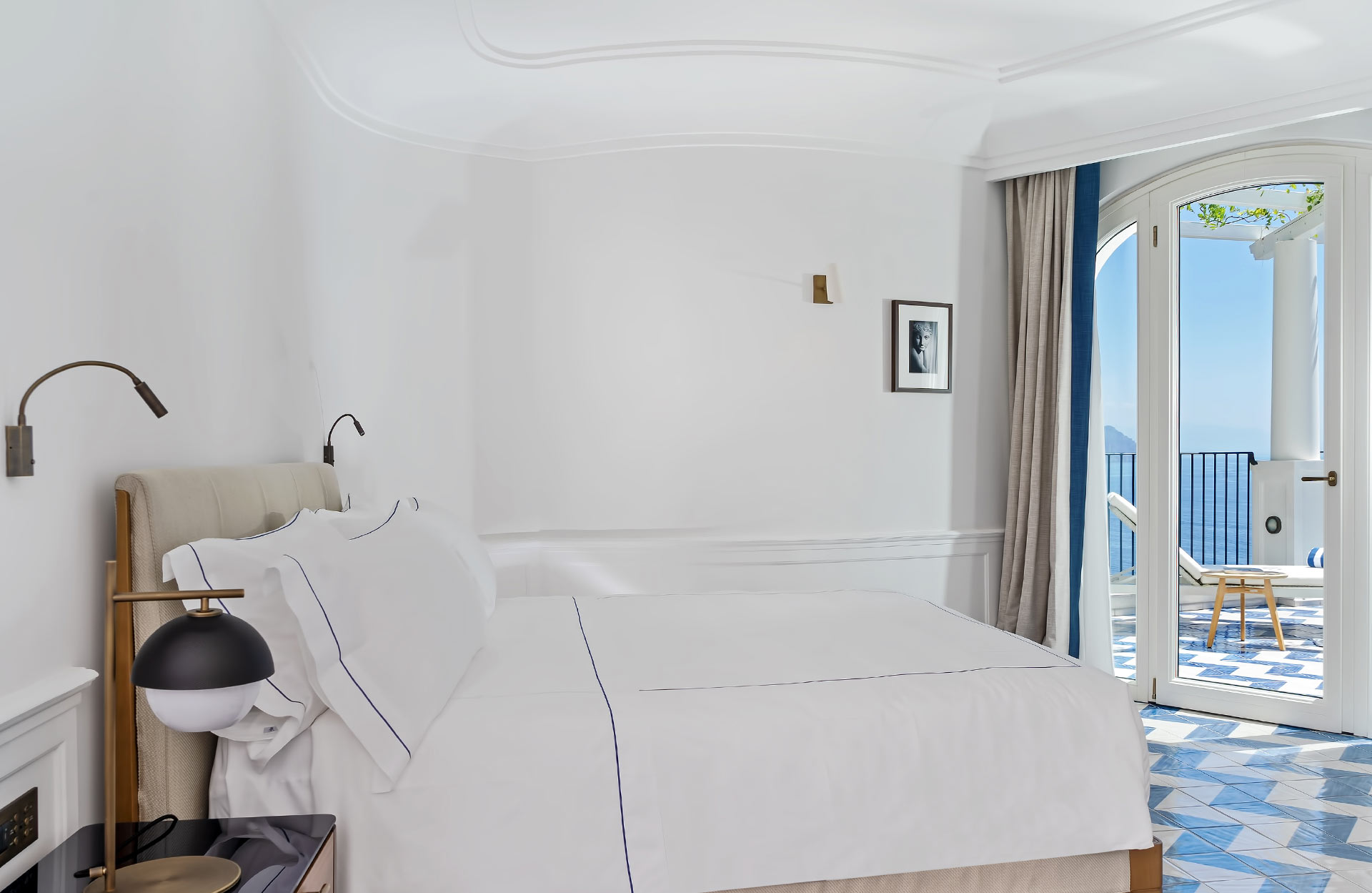 With flooring made from handmade ceramic tiles, a full-size marble bathroom, sun kissed terraces and sweeping sea views, the Deluxe Suite with Terrace is a lesson in iconic Italian hospitality.